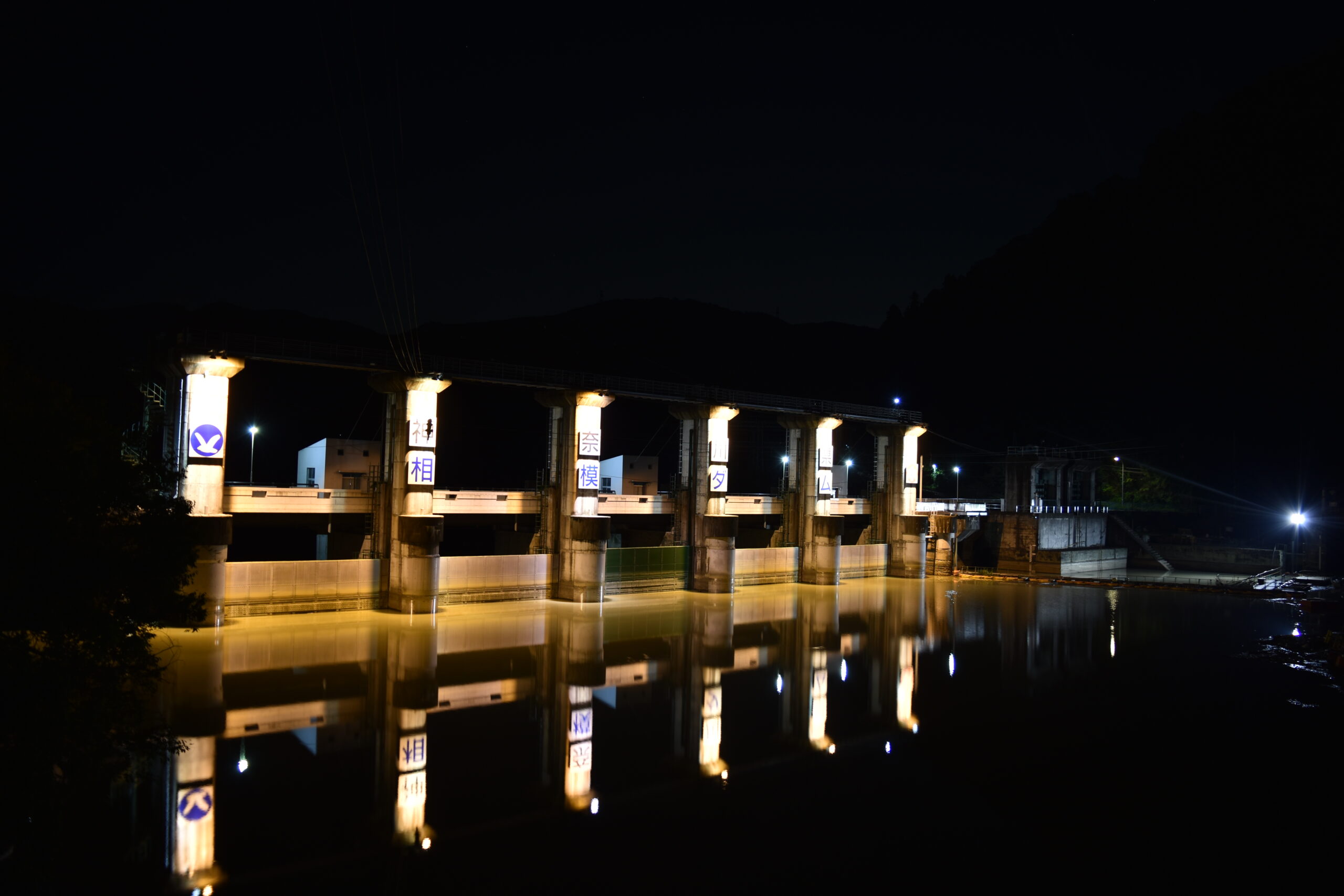 【特徴】通常は点灯していない照明灯を夜間に点灯させることで、ダムが湖面に浮かんでいるような不思議な光景をつくります。加えて、湖面にも光に輝くダムが映し出され幻想的な光景となります。